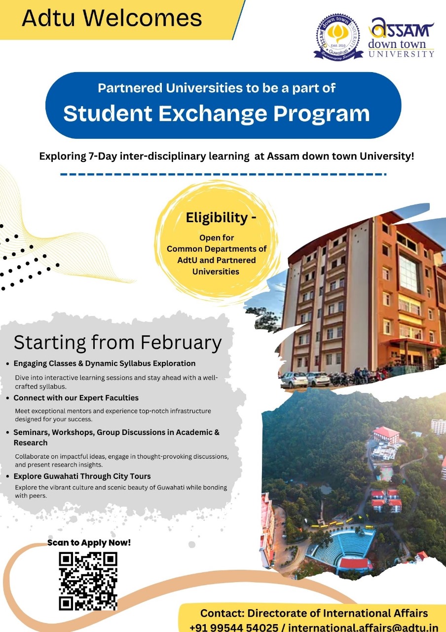 This enriching program will allow you to engage in stimulating workshops, interact with faculty and students from ADTU, and explore the vibrant culture of Assam. Imagine immersing yourself in a new environment, expanding your academic horizons, and building lasting connections with peers from another leading university.
